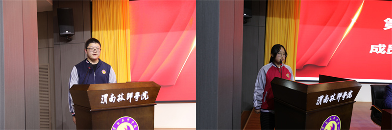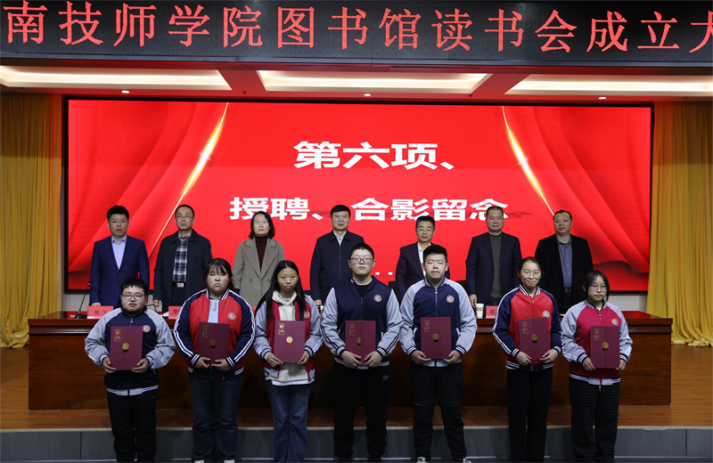 會上,圖書館館長李海波介紹了讀書會成立的背景,宣讀《讀書會章程》總則,院團委書記楊曉琪宣讀成立批復文件及干部聘任名單。經(jīng)過前期公開競聘與嚴格評審,選拔出了讀書會管理人員,與會領導為受聘學生頒發(fā)了聘書并合影留念。新任讀書會會長陳德軒、會員代表劉秦嘉同學分別表態(tài)發(fā)言,承諾積極投身閱讀活動,履職盡責,共同維護這一精神家園。